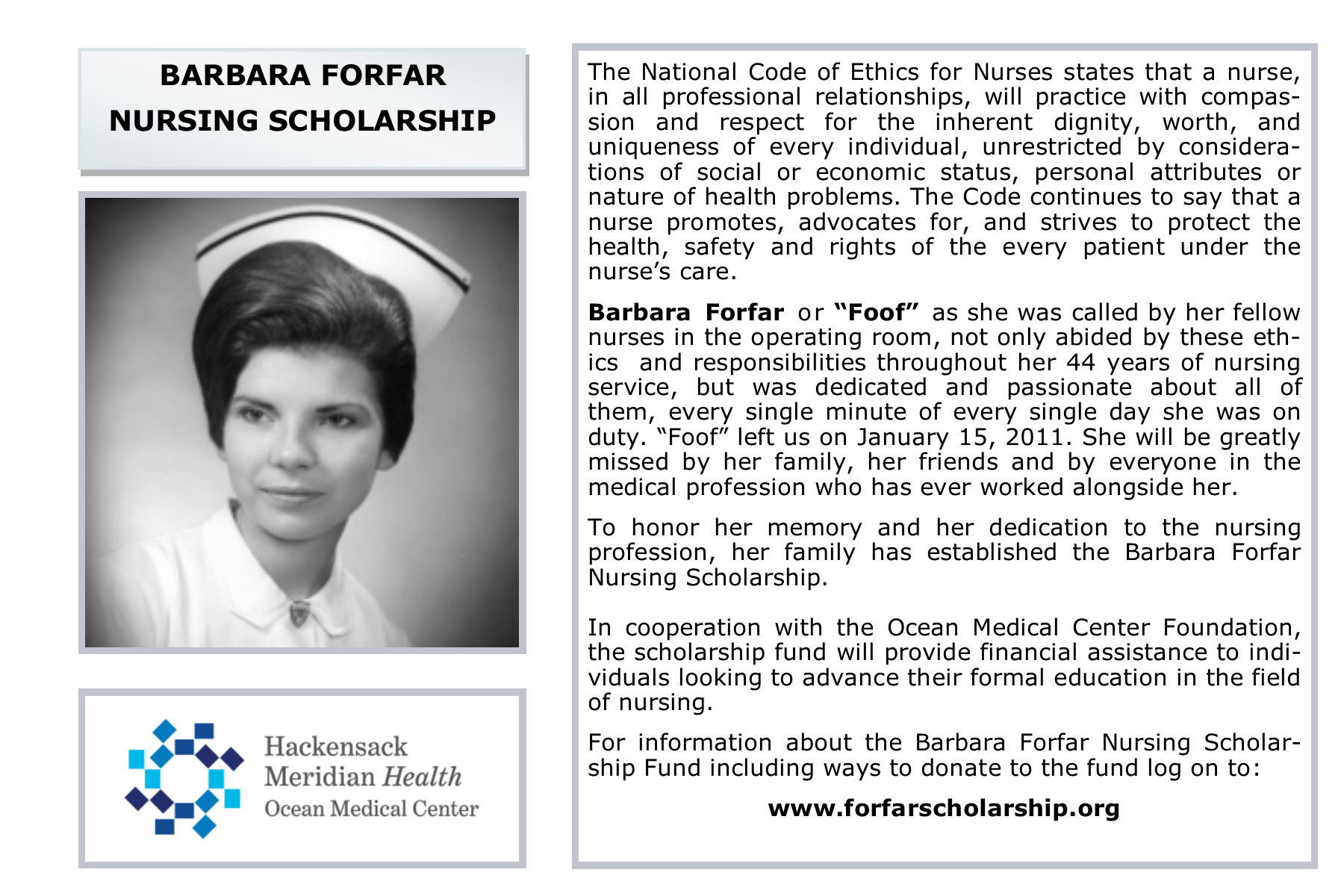 To honor her memory and dedication to the nursing profession, her family, in connection with the Ocean Medical Center Foundation, has established the Barbara Forfar Nursing Scholarship Fund.